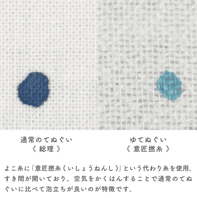 泡立ちが良く、使うたびに柔らかくなる風合いが特徴です。色落ちしにくい「捺染」の技法で染めており、浴室でも安心して使えます。